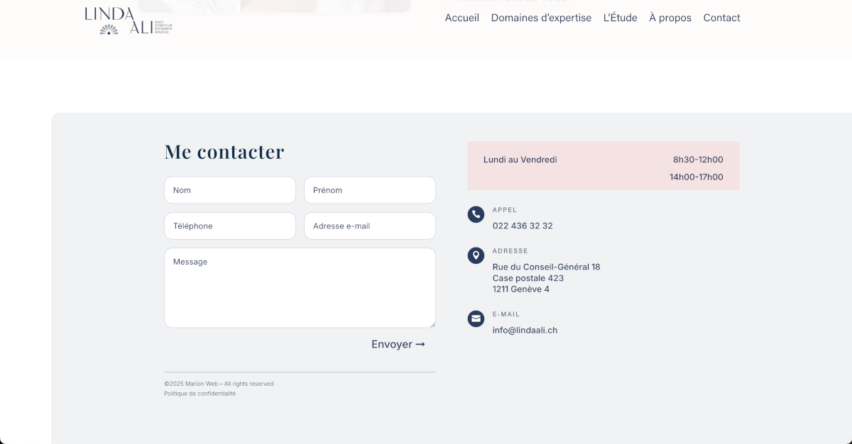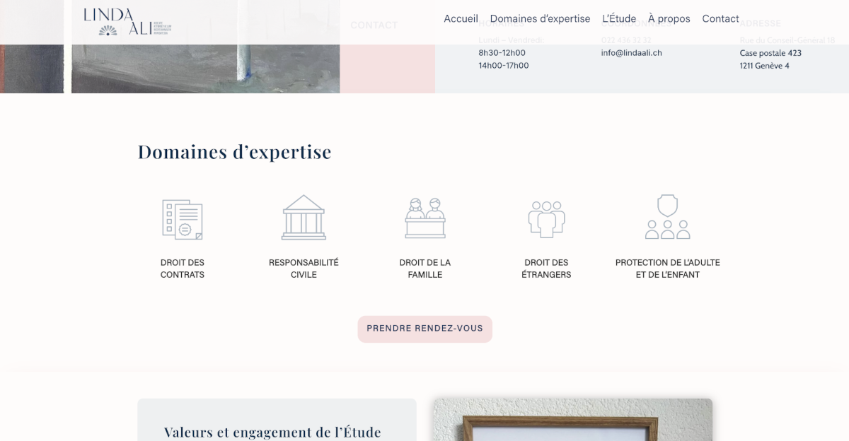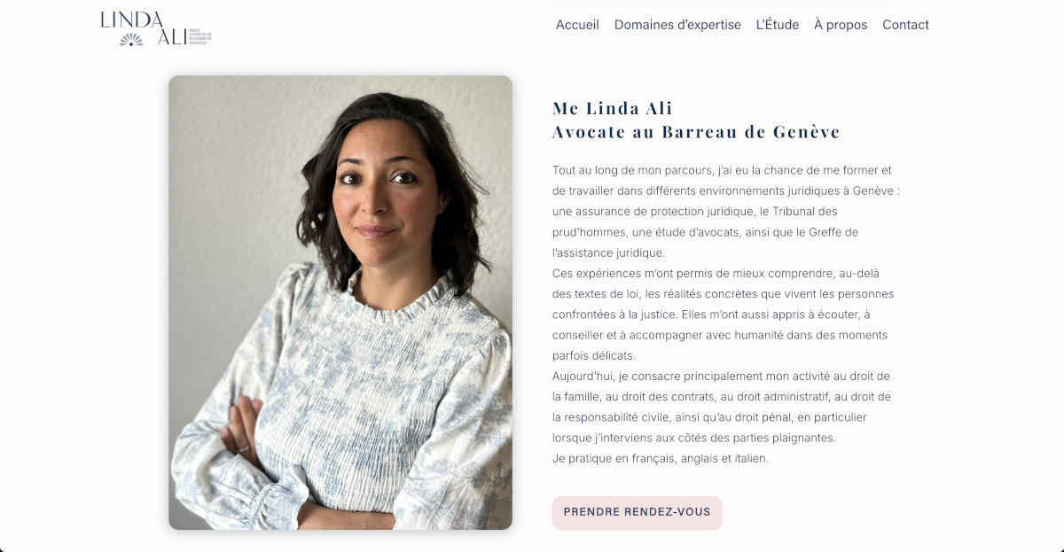Le site internet a pour objectif de présenter clairement les domaines d’expertise de Me Linda Ali, en mettant en avant son engagement professionnel et humain. Il vise à renforcer la visibilité de l’Étude en ligne, à faciliter le premier contact avec des clients recherchant une avocate qui conjugue compétence et proximité, et à refléter les valeurs d’écoute, de transparence et de détermination qui animent l’étude.